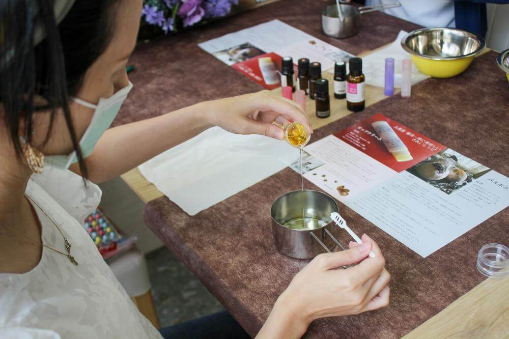 今回は、4つの講座がある「モンテカンゲ」さんの、バスボムとリップクリーム作りを覗いてみました。まずはリップクリーム作り。材料は椿油、みつろう、シアバター、好みのアロマオイルを入れて湯煎で溶かします。液体になるまで混ぜ合わせ、容器に空気が入らないように注いでいきます。半分くらい入れたらトントンと空気を抜き、残りは表面張力ギリギリまで入れます。体験では2本分できるので、ご家族やご友人にプレゼントしてもいいですね!