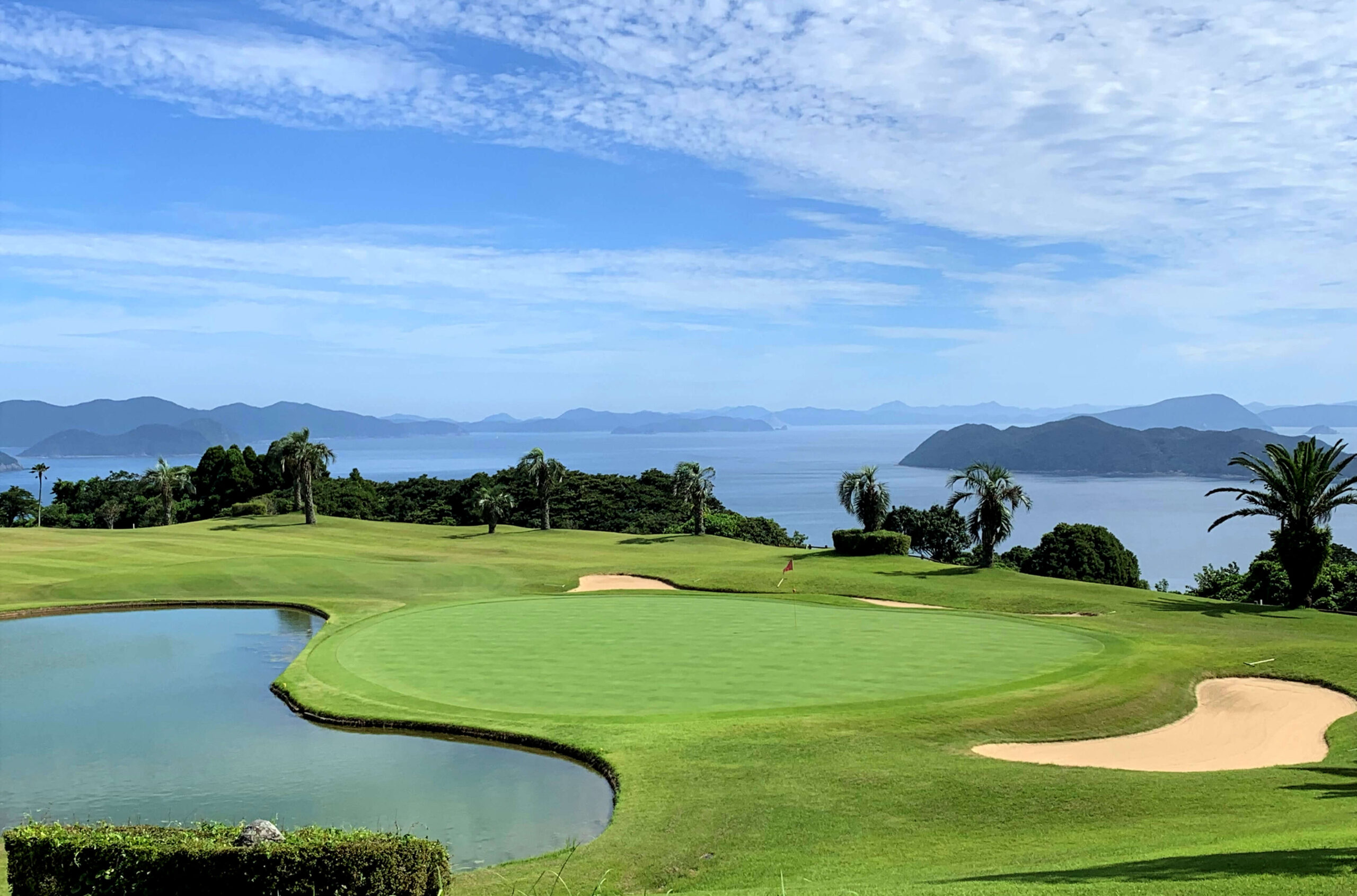 「コースはミドルが比較的に長く、スコアを出すのが少し難しいけれど、どのレベルの方にもほどよいコースが多いと思います。コースの歴史を辿ると、1~9番ホール『火の岳コース』は市主体で先行して作られており、自然の地形そのものを活かしたホールです。10~18番ホール『鬼岳コース』はその後造成したホールになっています。火の岳コースは福江の街並みと浮体式洋上風力発電が、鬼岳コースは鬼岳や黒島、富江半島が望めます。」 西海国立公園内に位置しているコースでもあり、国内でも珍しいのではないでしょうか。