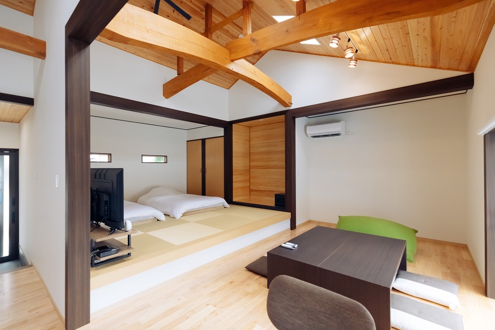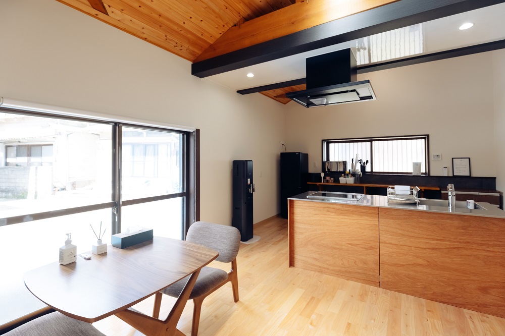 荒川のかけ流し温泉を使い、心休まる個室温泉設備を整えています。天窓から明るい日差しが差し込むリビングには、厳選したインテリアを配置し、最大限くつろいでいただける空間にしております。カップルはもちろん家族でも利用できる一棟貸し施設となっておりますので、五島で贅沢な時間を過ごしたい方はぜひご利用ください。