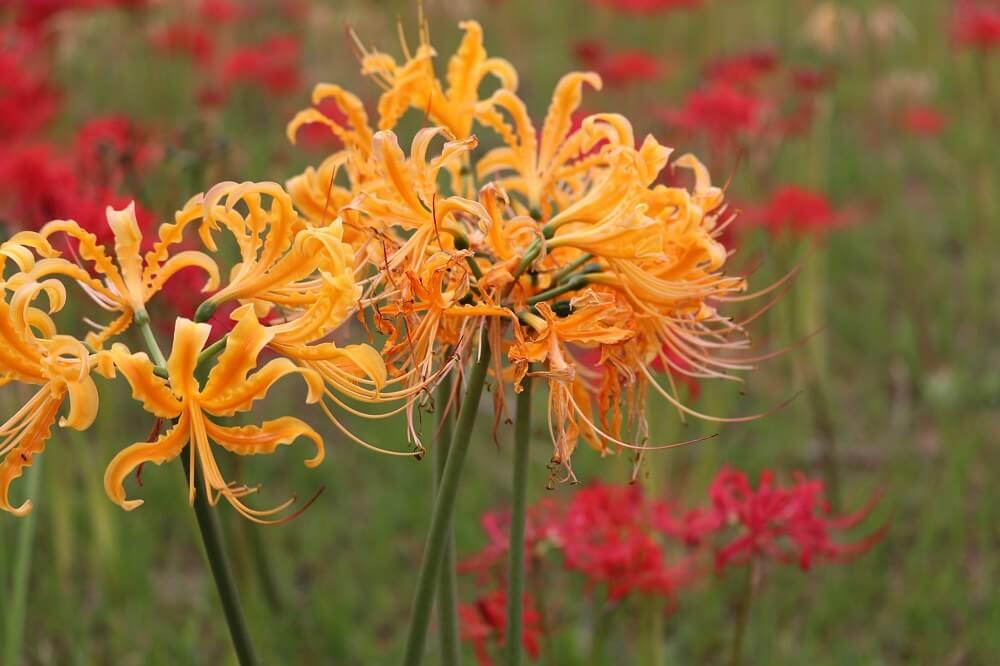 万葉公園を赤色に染める中、ポツポツと黄色の彼岸花も咲いていて綺麗でした。一番古い彼岸花の登場は、柿本人麿呂が、万葉集の詩の中で謳ったのが、初めだと言われているそうです。