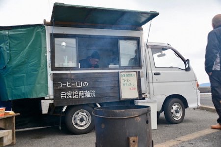 福江港から丸木漁港方面へ車で5分(徒歩約15分)。福江魚市の前、広い駐車場の一角にひっそりと佇む移動販売のコーヒー屋さん「コーヒー山」。